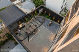 En el corazón del edificio, un patio central genera un flujo constante de luz y aire, aportando bienestar a cada unidad y destacando la importancia de la calidad ambiental en el diseño. Los palieres abiertos y las visuales despejadas completan esta propuesta, integrando de manera armónica la arquitectura con su entorno.